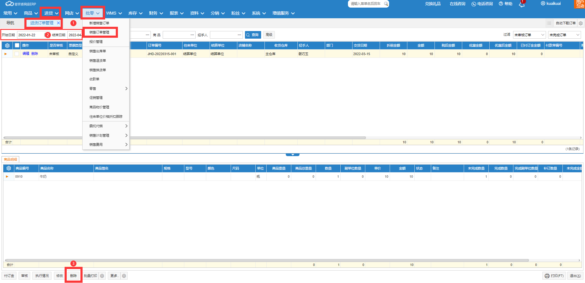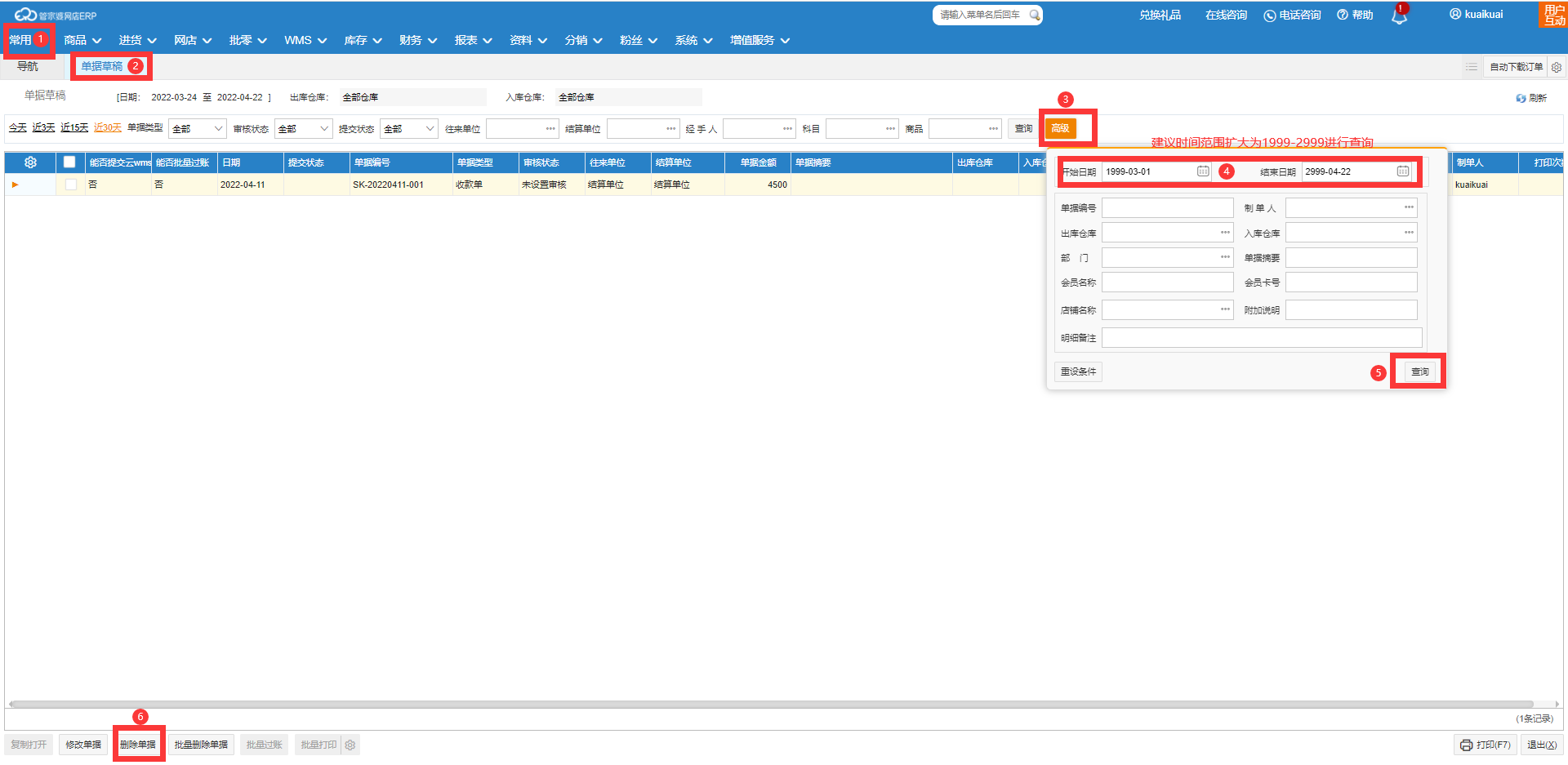 因此年结存后,需要在【常用】-【单据草稿】、【进货】-【进货订单管理】和【批零】-【销售订单管理】页面,