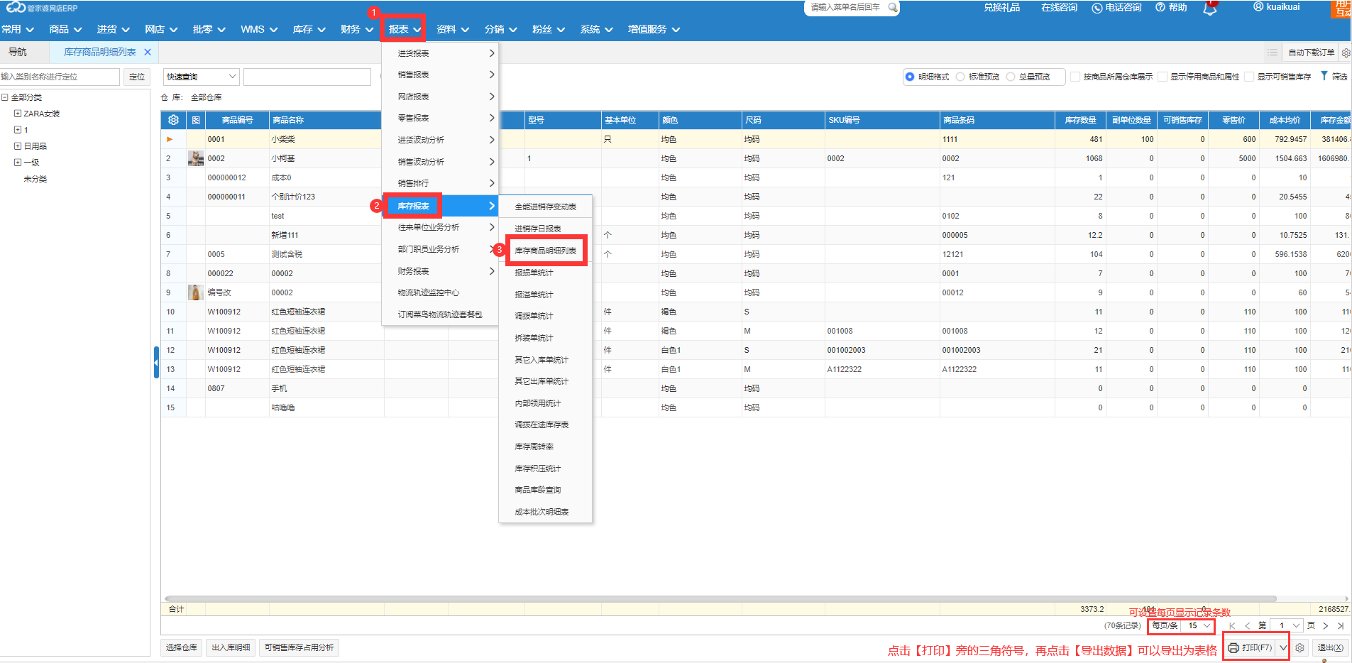 您好,若您是属性行业,可以在【报表】-【库存报表】-【库存商品明细列表】查看商品不同颜色尺码的库存数量。